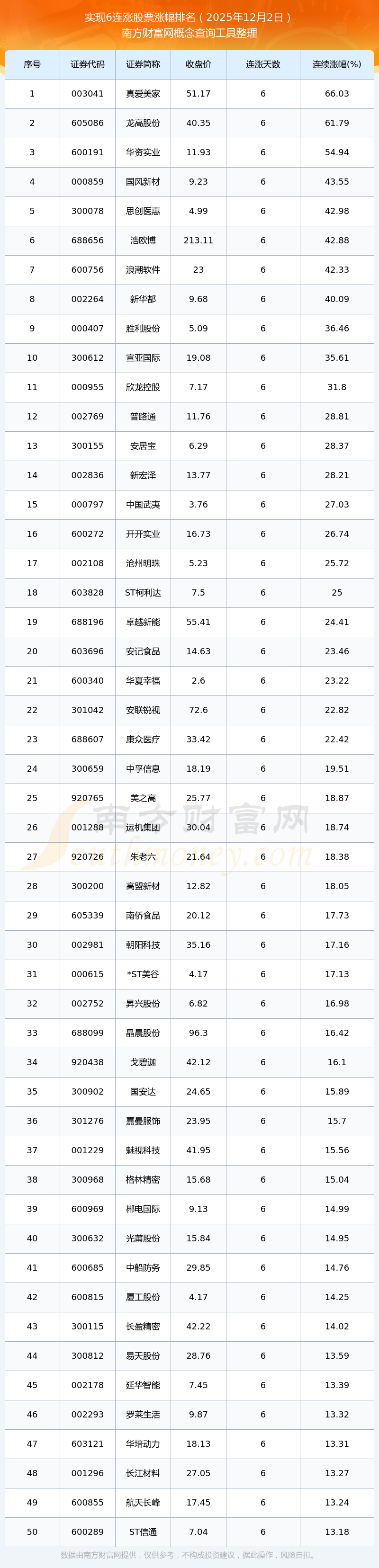 根据南方财富网概念查询工具数据统计,截止2025年12月2日收盘,共有114只个股实现6天连涨。其中连续涨幅较大的个股有真爱美家、龙高股份、华资实业等,连续涨幅分别为66.03%、61.79%、54.94%。