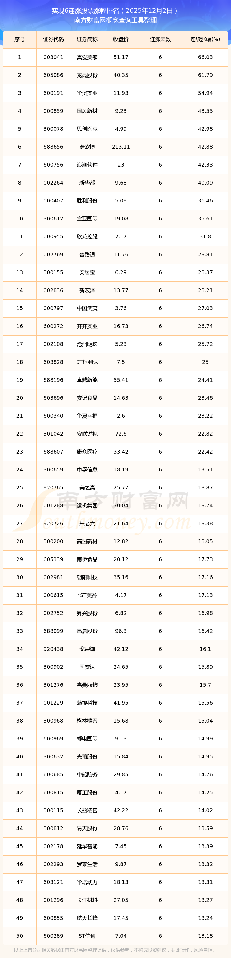 根据南方财富网概念查询工具数据统计,截止2025年12月2日收盘,共有114只个股实现6天连涨。其中连续涨幅较大的个股有真爱美家、龙高股份、华资实业等,连续涨幅分别为66.03%、61.79%、54.94%。