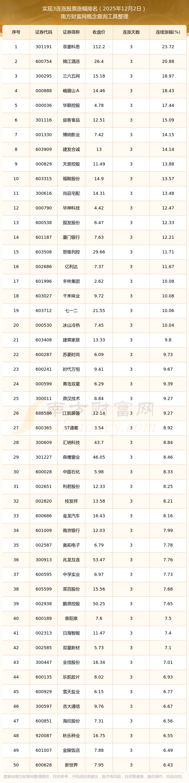 根据南方财富网概念查询工具数据统计,截止2025年12月2日收盘,共有160只个股实现3天连涨。其中连续涨幅较大的个股有菲菱科思、锦江酒店、三六五网等,连续涨幅分别为23.72%、20.88%、18.97%。