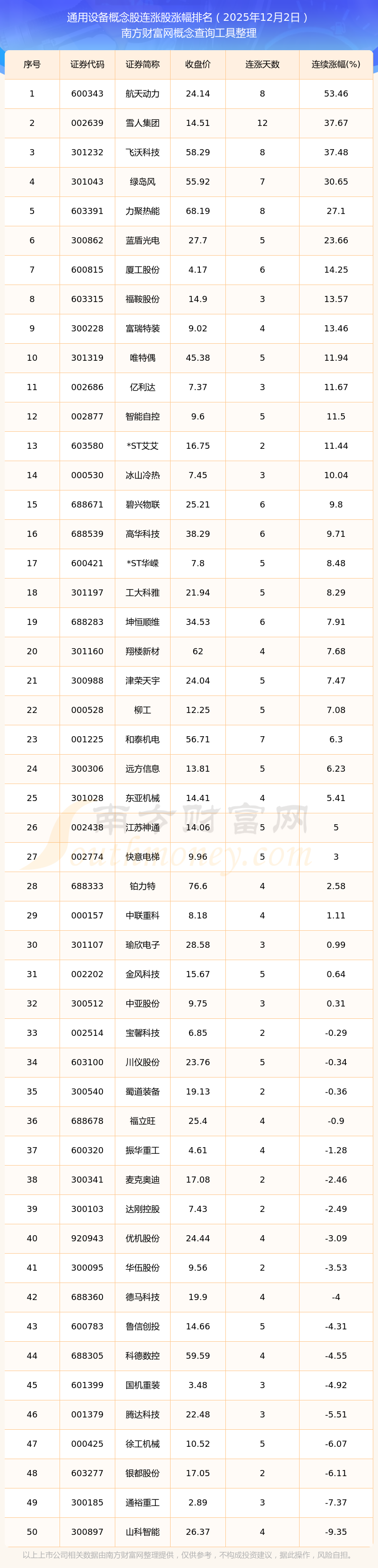 根据南方财富网概念查询工具数据统计,截止2025年12月2日收盘,通用设备概念股共有52只个股实现连涨。其中连续涨幅较大的个股有航天动力、雪人集团、飞沃科技等,连续涨幅分别为53.46%、37.67%、37.48%。