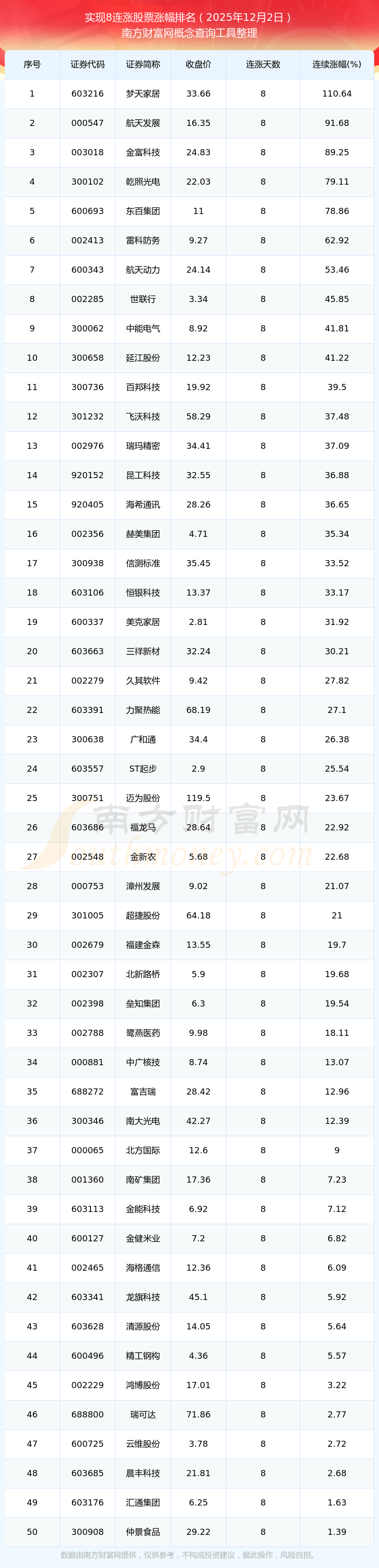根据南方财富网概念查询工具数据统计,截止2025年12月2日收盘,共有53只个股实现8天连涨。其中连续涨幅较大的个股有梦天家居、航天发展、金富科技等,连续涨幅分别为110.64%、91.68%、89.25%。