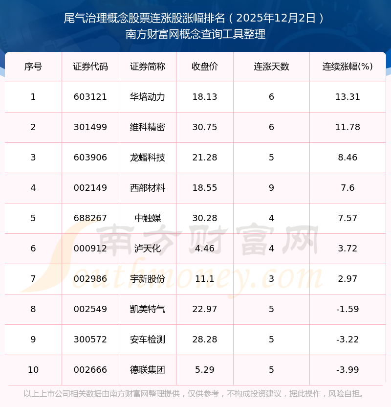 根据南方财富网概念查询工具数据统计,截止2025年12月2日收盘,尾气治理概念股票共有10只个股实现连涨。其中连续涨幅较大的个股有华培动力、维科精密、龙蟠科技等,连续涨幅分别为13.31%、11.78%、8.46%。