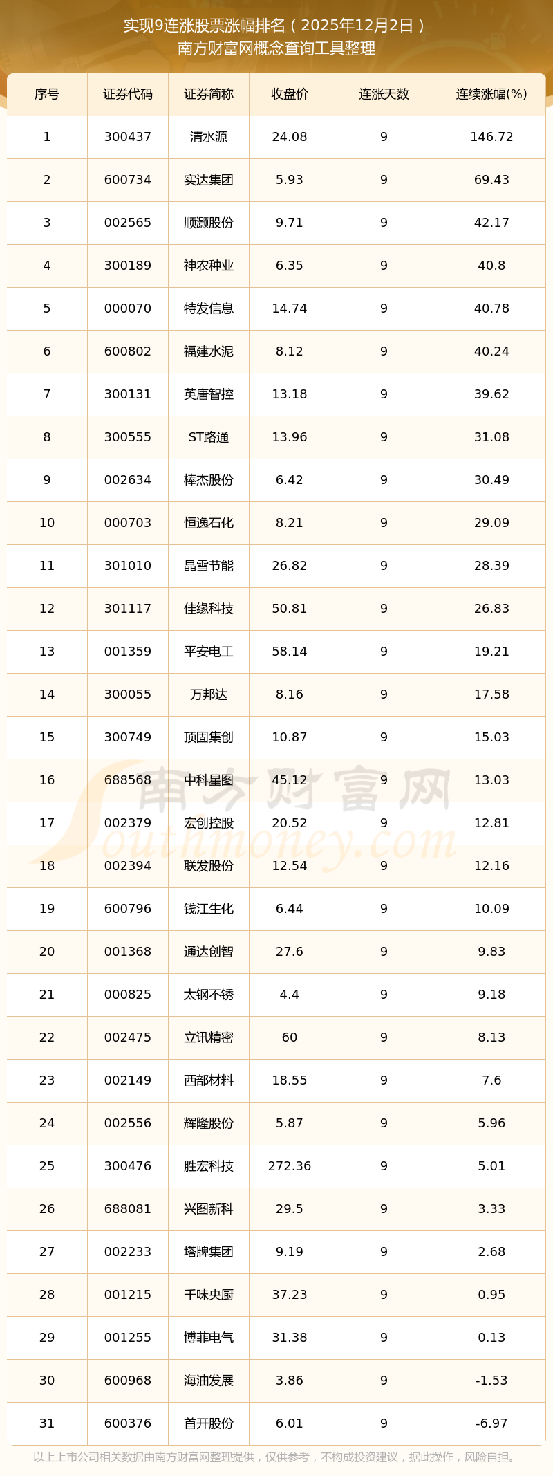 根据南方财富网概念查询工具数据统计,截止2025年12月2日收盘,共有31只个股实现9天连涨。其中连续涨幅较大的个股有清水源、实达集团、顺灏股份等,连续涨幅分别为146.72%、69.43%、42.17%。