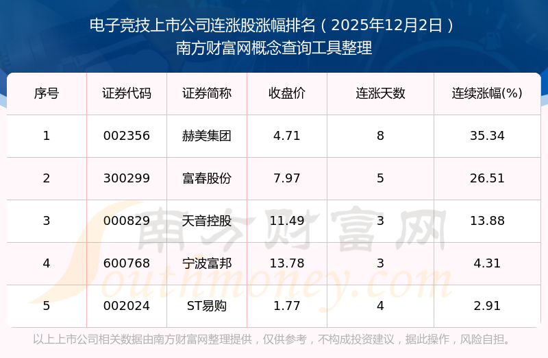 根据南方财富网概念查询工具数据统计,截止2025年12月2日收盘,电子竞技上市公司共有5只个股实现连涨。其中连续涨幅较大的个股有赫美集团、富春股份、天音控股等,连续涨幅分别为35.34%、26.51%、13.88%。