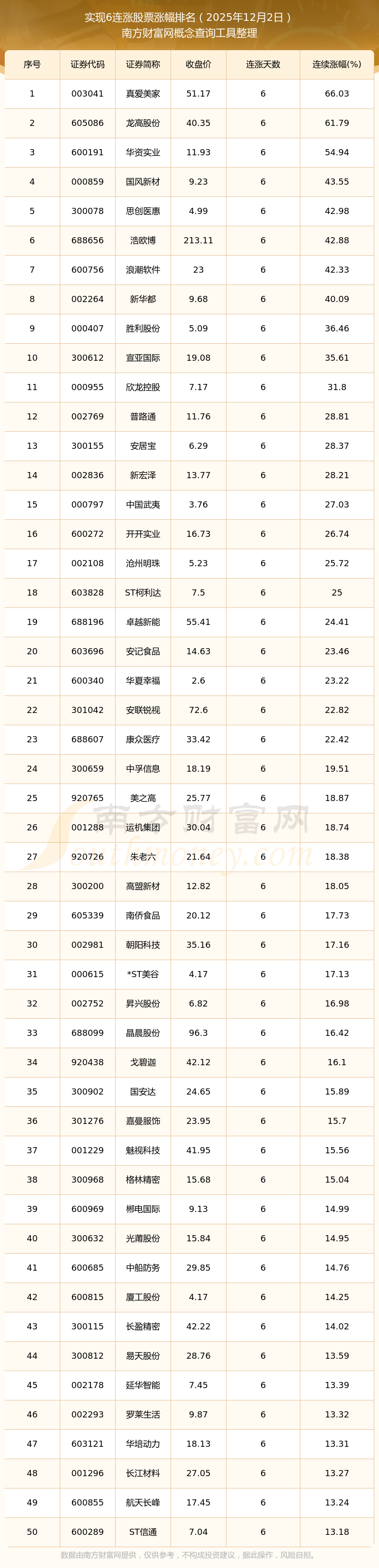 根据南方财富网概念查询工具数据统计,截止2025年12月2日收盘,共有114只个股实现6天连涨。其中连续涨幅较大的个股有真爱美家、龙高股份、华资实业等,连续涨幅分别为66.03%、61.79%、54.94%。