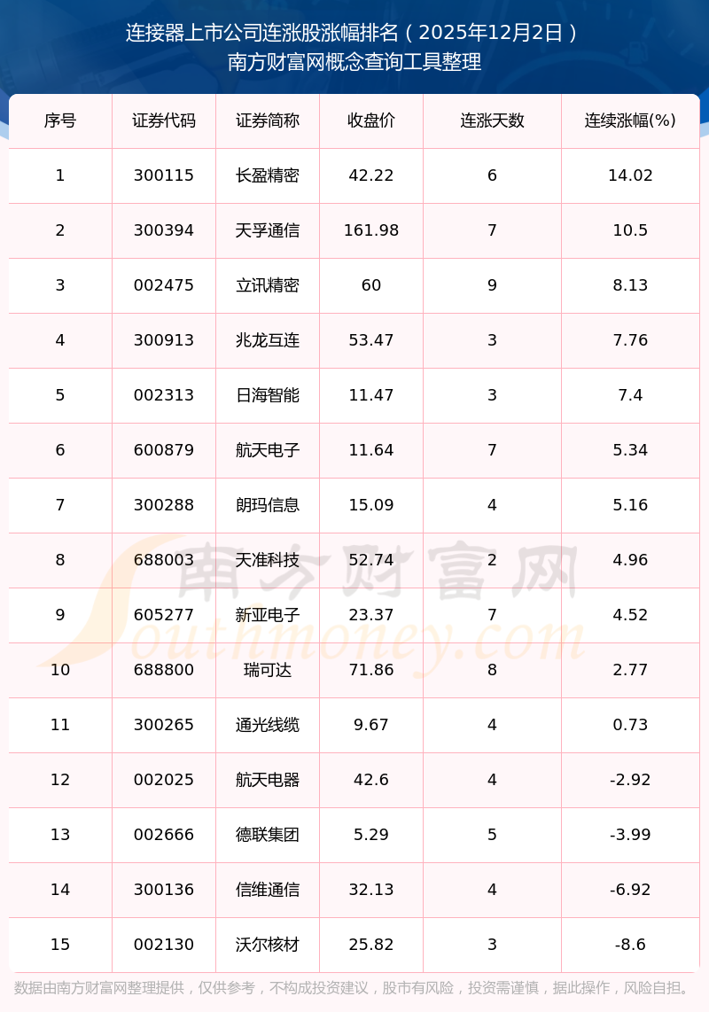 2025年12月2日连接器上市公司连涨股涨幅排名
