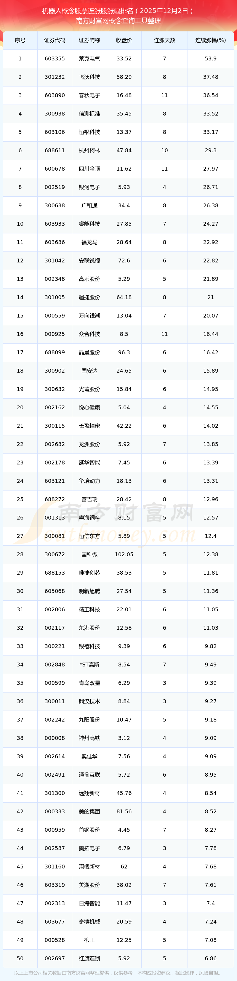 2025年12月2日机器人概念股票连涨股涨幅排名