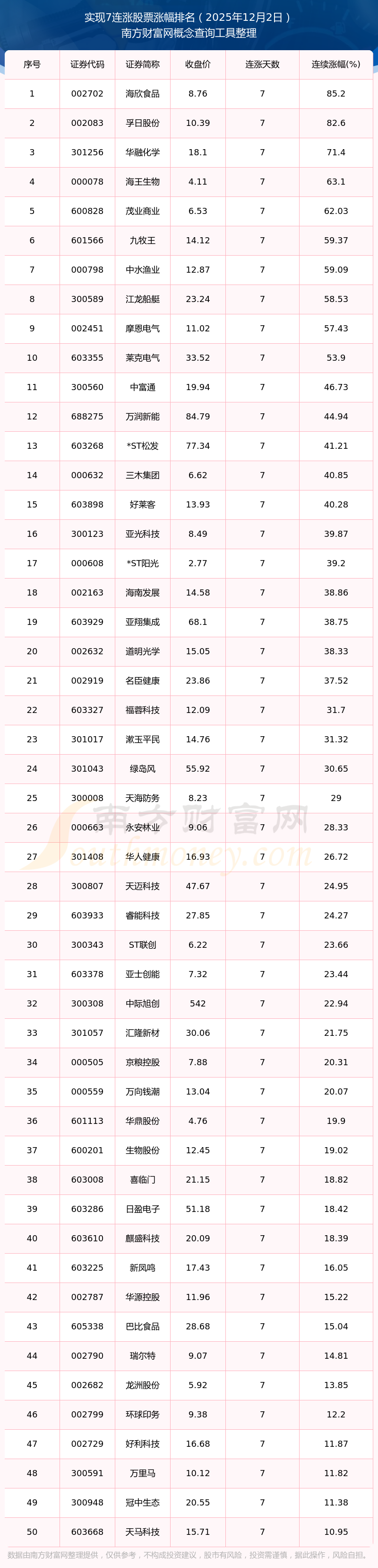 根据南方财富网概念查询工具数据统计,截止2025年12月2日收盘,共有83只个股实现7天连涨。其中连续涨幅较大的个股有海欣食品、孚日股份、华融化学等,连续涨幅分别为85.20%、82.60%、71.40%。