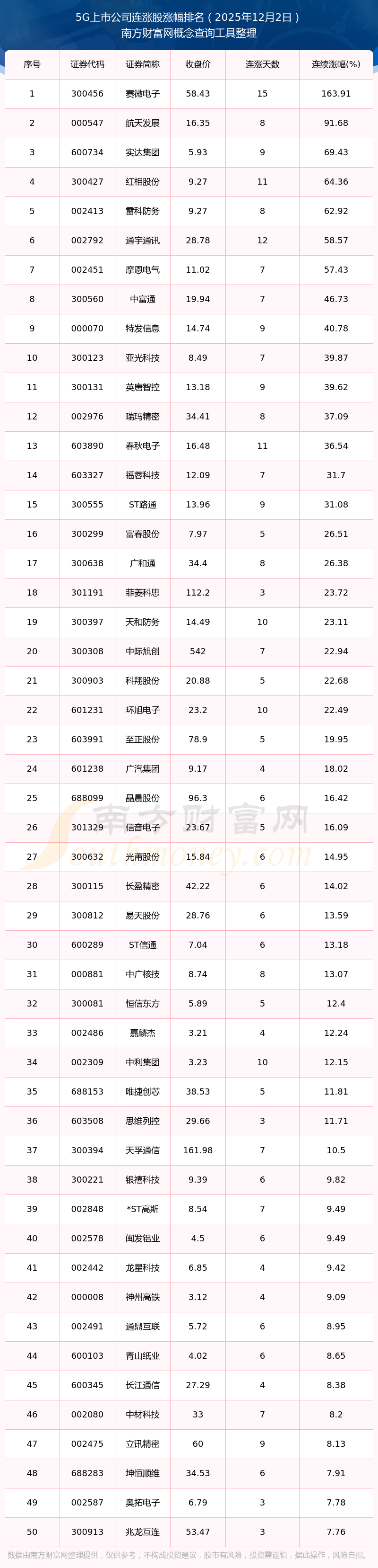 根据南方财富网概念查询工具数据统计,截止2025年12月2日收盘,5G上市公司共有102只个股实现连涨。其中连续涨幅较大的个股有赛微电子、航天发展、实达集团等,连续涨幅分别为163.91%、91.68%、69.43%。