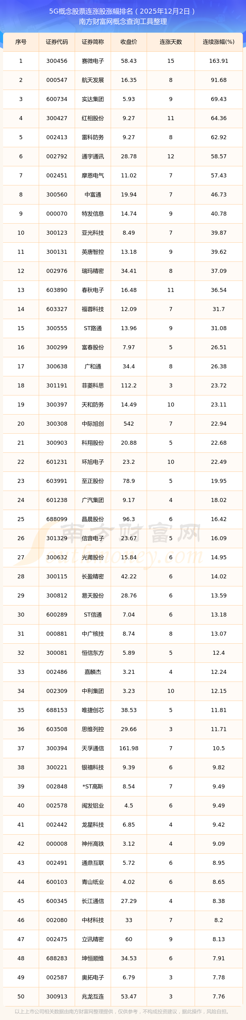 2025年12月2日5G概念股票连涨股票涨幅排名