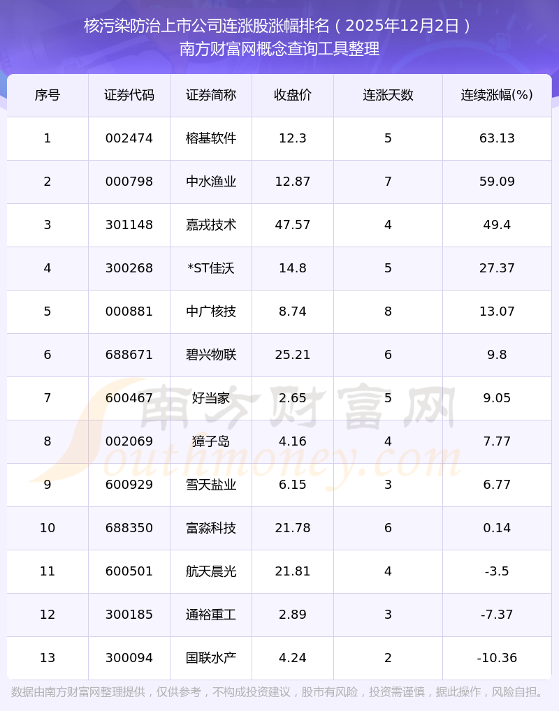 根据南方财富网概念查询工具数据统计,截止2025年12月2日收盘,核污染防治上市公司共有13只个股实现连涨。其中连续涨幅较大的个股有榕基软件、中水渔业、嘉戎技术等,连续涨幅分别为63.13%、59.09%、49.40%。