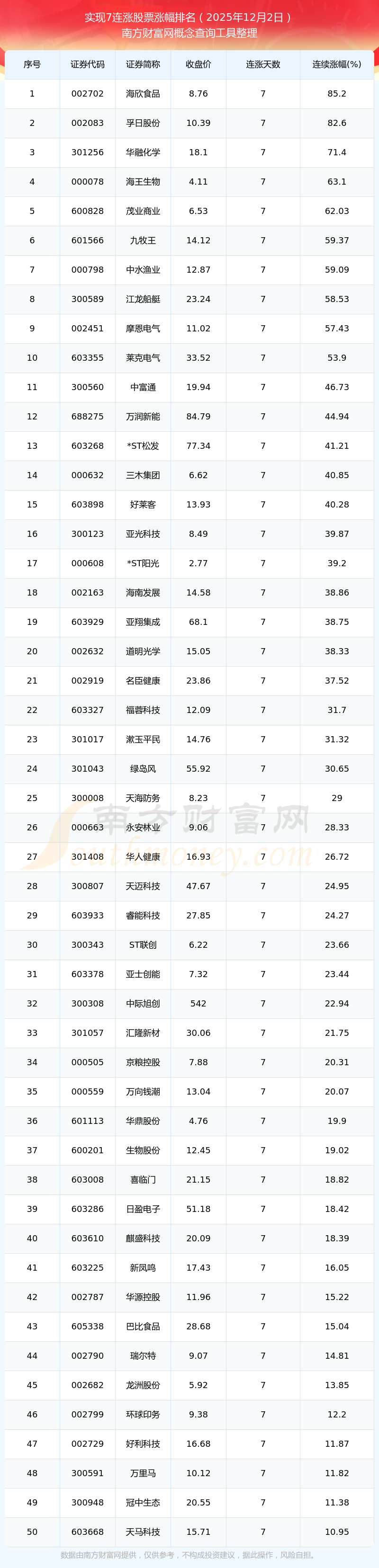 根据南方财富网概念查询工具数据统计,截止2025年12月2日收盘,共有83只个股实现7天连涨。其中连续涨幅较大的个股有海欣食品、孚日股份、华融化学等,连续涨幅分别为85.20%、82.60%、71.40%。