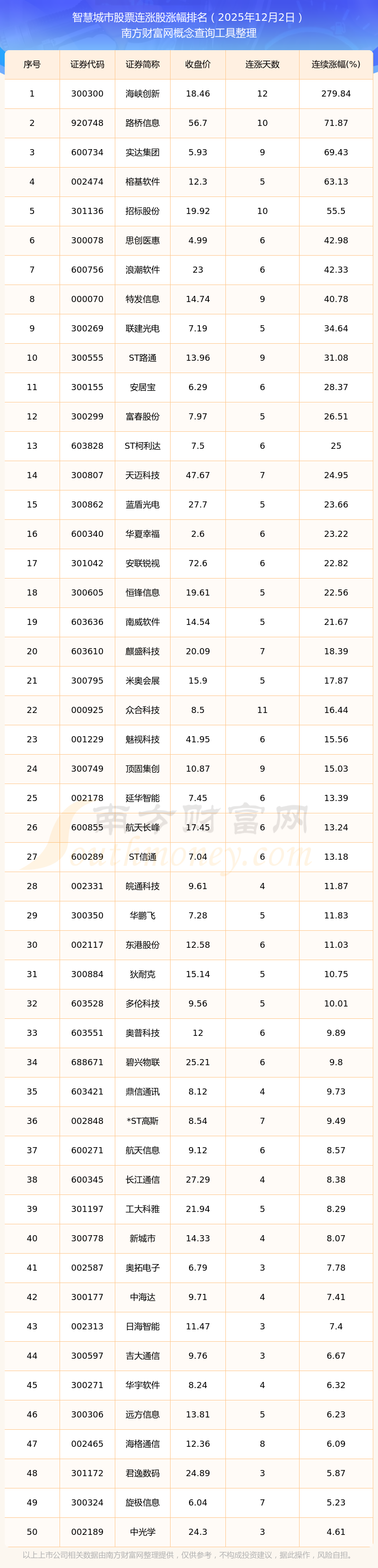 2025年12月2日智慧城市股票连涨股涨幅排名