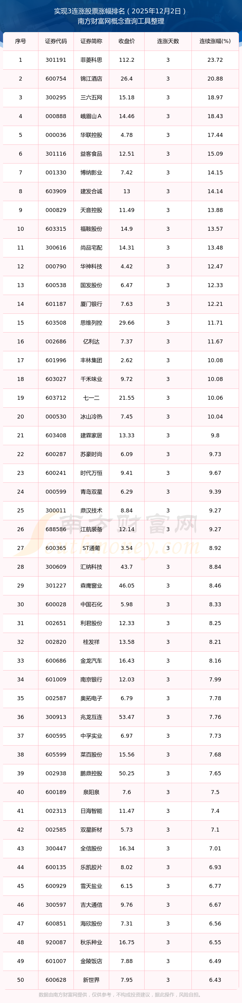 根据南方财富网概念查询工具数据统计,截止2025年12月2日收盘,共有160只个股实现3天连涨。其中连续涨幅较大的个股有菲菱科思、锦江酒店、三六五网等,连续涨幅分别为23.72%、20.88%、18.97%。