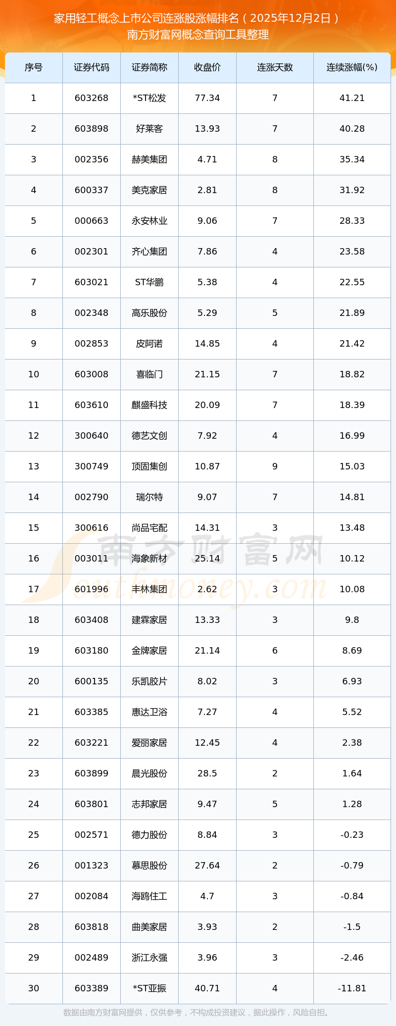 根据南方财富网概念查询工具数据统计,截止2025年12月2日收盘,家用轻工概念上市公司共有30只个股实现连涨。其中连续涨幅较大的个股有*ST松发、好莱客、赫美集团等,连续涨幅分别为41.21%、40.28%、35.34%。