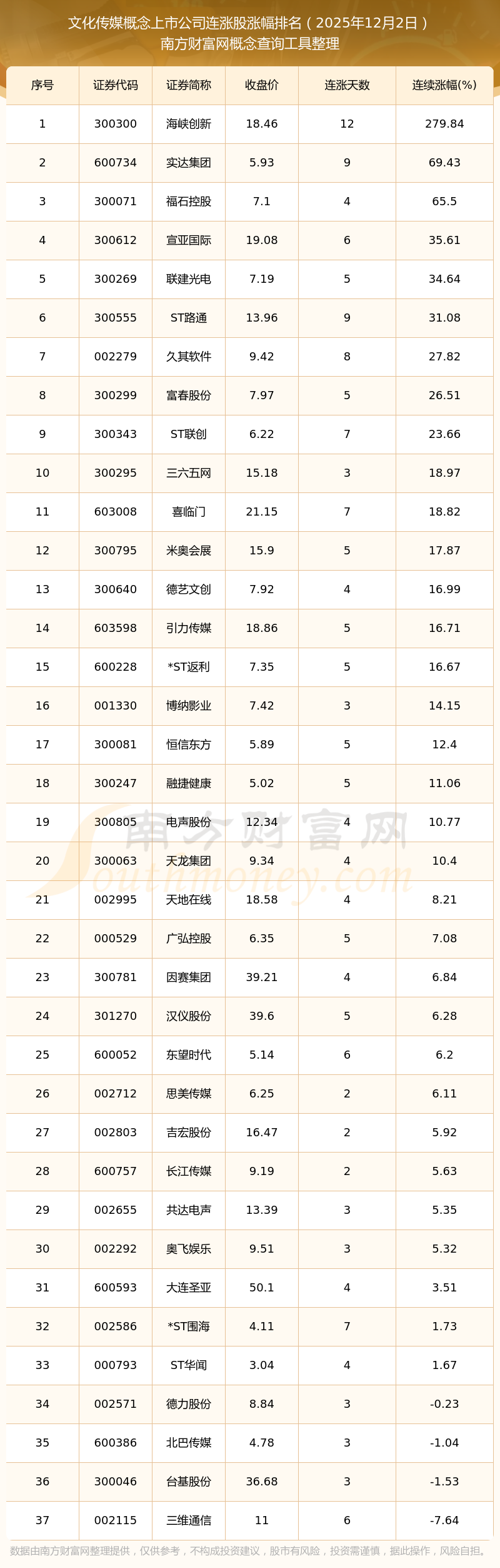根据南方财富网概念查询工具数据统计,截止2025年12月2日收盘,文化传媒概念上市公司共有37只个股实现连涨。其中连续涨幅较大的个股有海峡创新、实达集团、福石控股等,连续涨幅分别为279.84%、69.43%、65.50%。