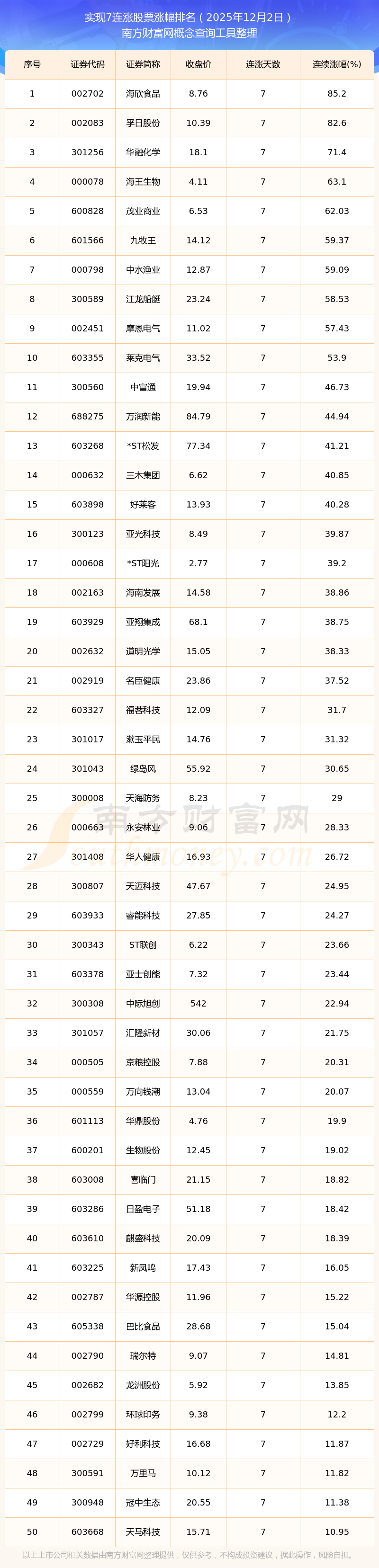 根据南方财富网概念查询工具数据统计,截止2025年12月2日收盘,共有83只个股实现7天连涨。其中连续涨幅较大的个股有海欣食品、孚日股份、华融化学等,连续涨幅分别为85.20%、82.60%、71.40%。