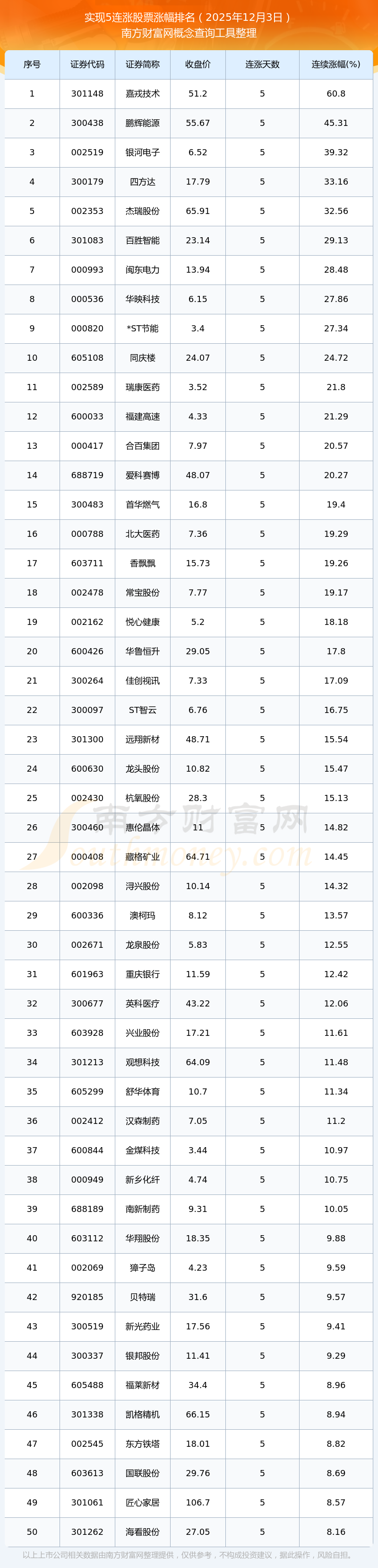 2025年12月3日连涨5天的股票涨幅排名