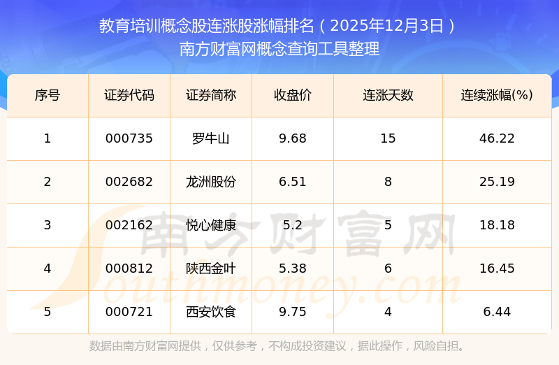 根据南方财富网概念查询工具数据统计,截止2025年12月3日收盘,教育培训概念股共有5只个股实现连涨。其中连续涨幅较大的个股有罗牛山、龙洲股份、悦心健康等,连续涨幅分别为46.22%、25.19%、18.18%。