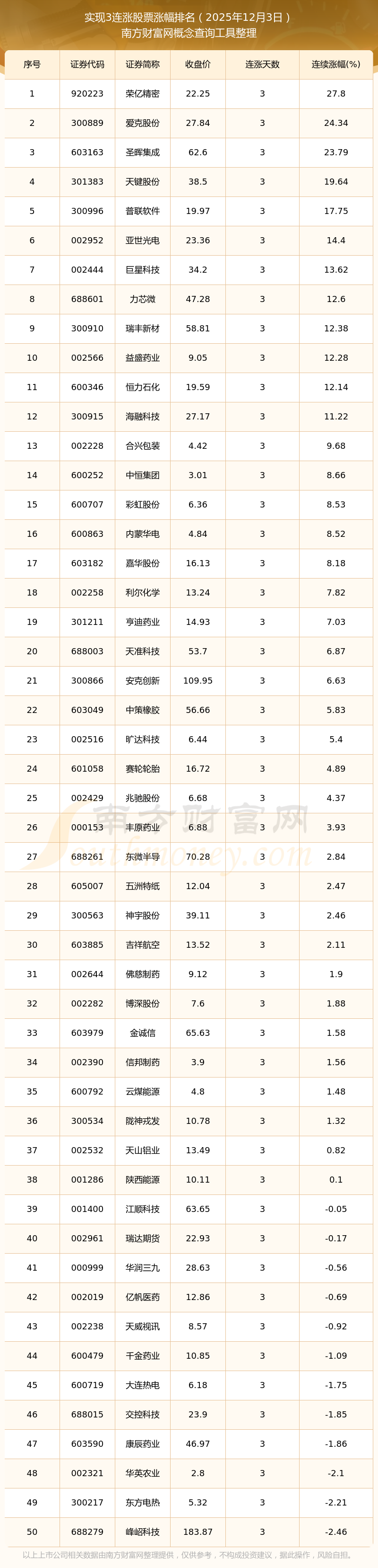 根据南方财富网概念查询工具数据统计,截止2025年12月3日收盘,共有69只个股实现3天连涨。其中连续涨幅较大的个股有荣亿精密、爱克股份、圣晖集成等,连续涨幅分别为27.80%、24.34%、23.79%。