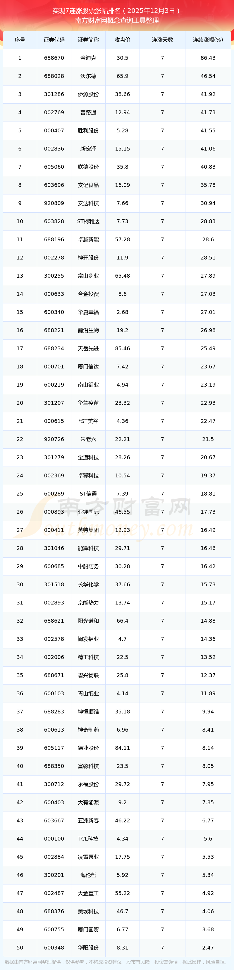 根据南方财富网概念查询工具数据统计,截止2025年12月3日收盘,共有59只个股实现7天连涨。其中连续涨幅较大的个股有金迪克、沃尔德、侨源股份等,连续涨幅分别为86.43%、46.54%、41.92%。