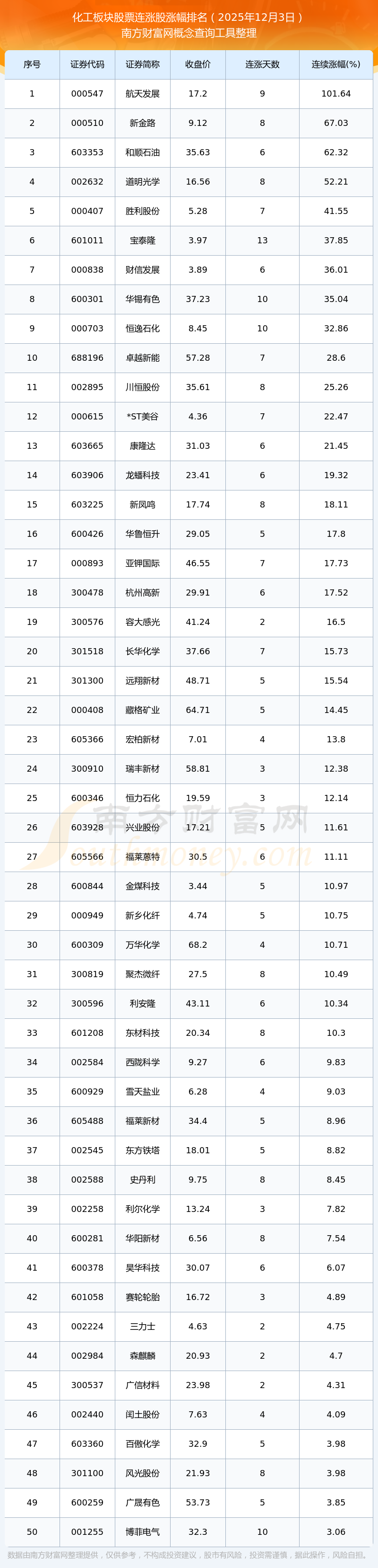 2025年12月3日化工板块股票连涨股票涨幅排名