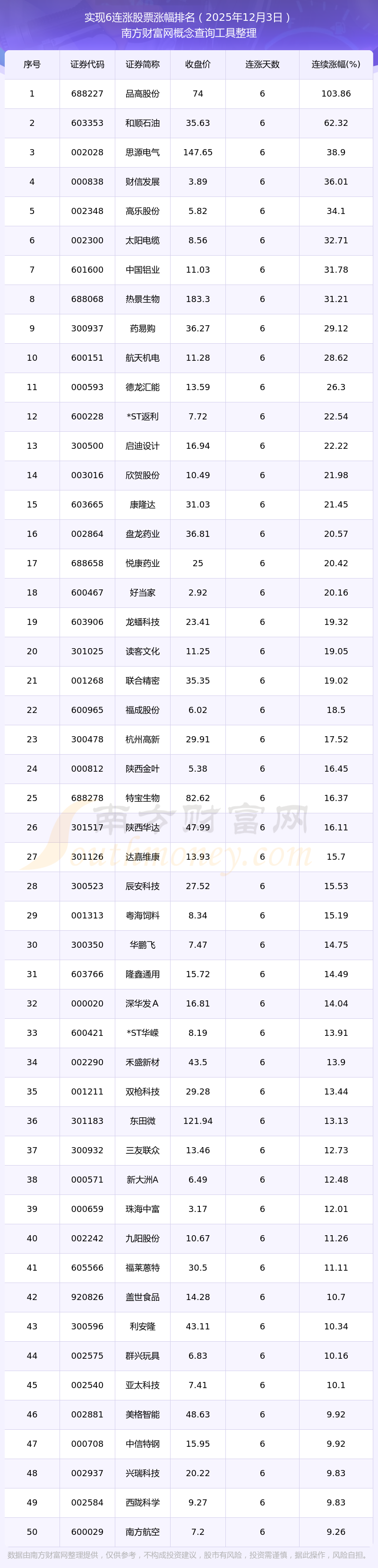 根据南方财富网概念查询工具数据统计,截止2025年12月3日收盘,共有82只个股实现6天连涨。其中连续涨幅较大的个股有品高股份、和顺石油、思源电气等,连续涨幅分别为103.86%、62.32%、38.90%。 2025年12月3日实现6连涨股票涨幅排名 数据由南方财富网提供,仅