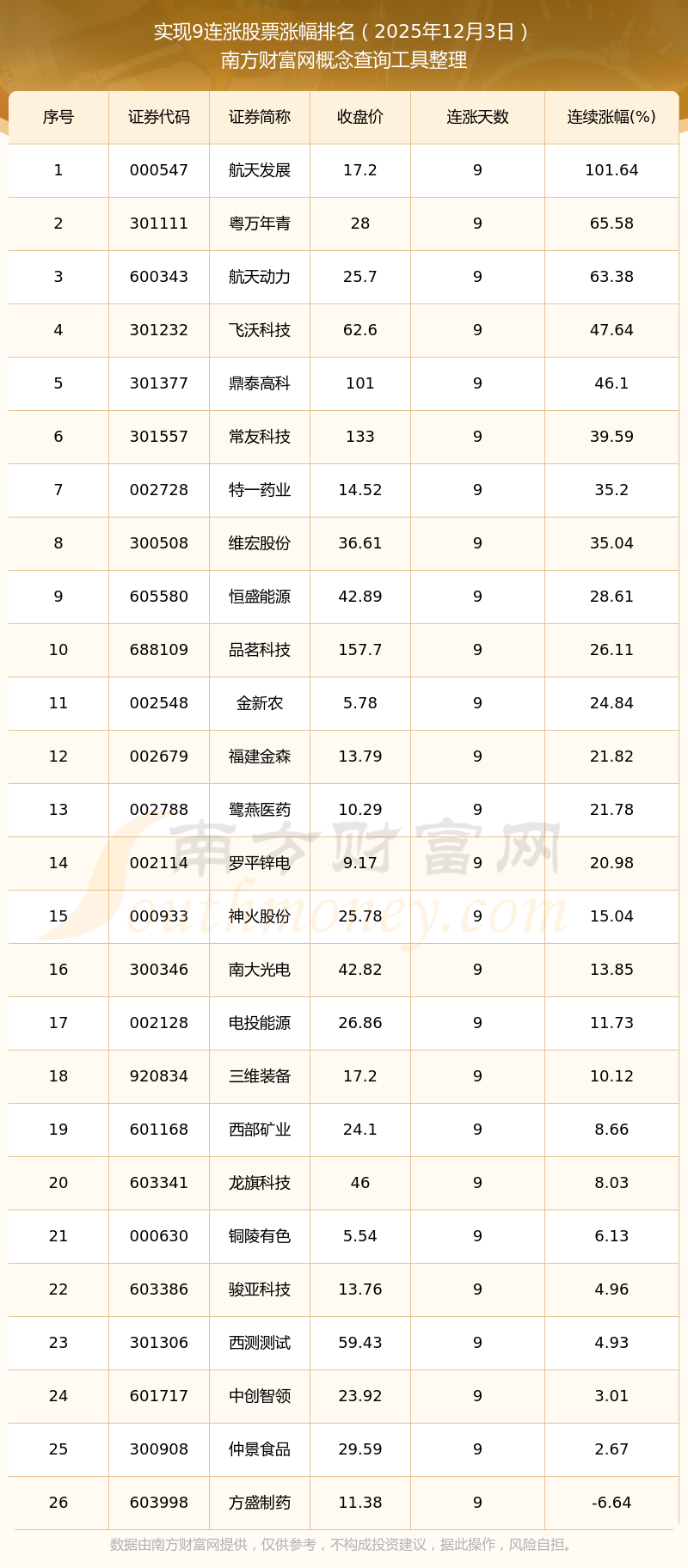 根据南方财富网概念查询工具数据统计,截止2025年12月3日收盘,共有26只个股实现9天连涨。其中连续涨幅较大的个股有航天发展、粤万年青、航天动力等,连续涨幅分别为101.64%、65.58%、63.38%。