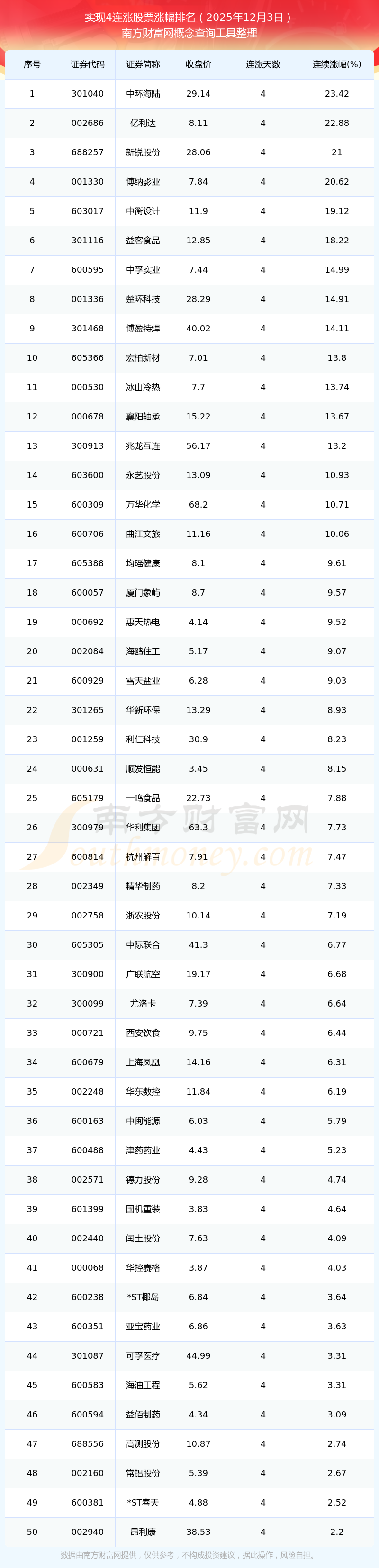 根据南方财富网概念查询工具数据统计,截止2025年12月3日收盘,共有95只个股实现4天连涨。其中连续涨幅较大的个股有中环海陆、亿利达、新锐股份等,连续涨幅分别为23.42%、22.88%、21.00%。