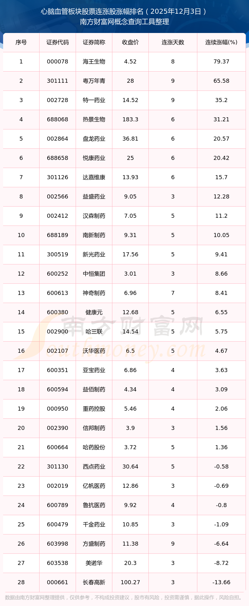 2025年12月3日心脑血管板块股票连涨股涨幅排名