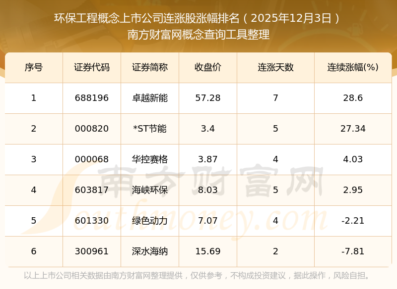 根据南方财富网概念查询工具数据统计,截止2025年12月3日收盘,环保工程概念上市公司共有6只个股实现连涨。其中连续涨幅较大的个股有卓越新能、*ST节能、华控赛格等,连续涨幅分别为28.60%、27.34%、4.03%。