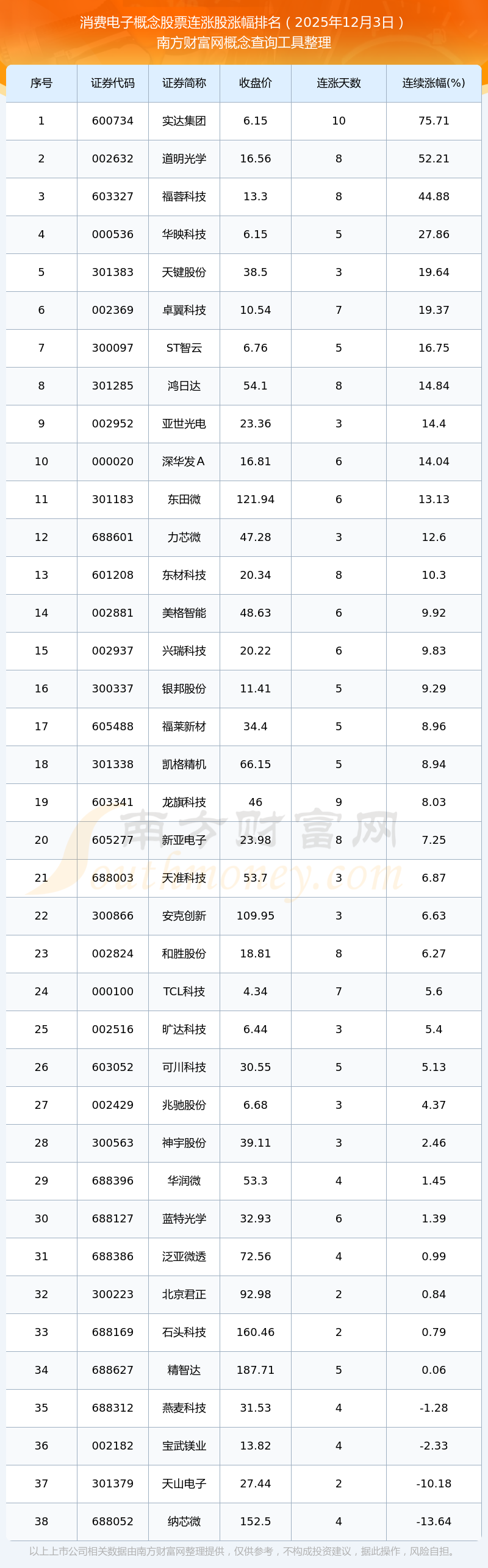 根据南方财富网概念查询工具数据统计,截止2025年12月3日收盘,消费电子概念股票共有38只个股实现连涨。其中连续涨幅较大的个股有实达集团、道明光学、福蓉科技等,连续涨幅分别为75.71%、52.21%、44.88%。