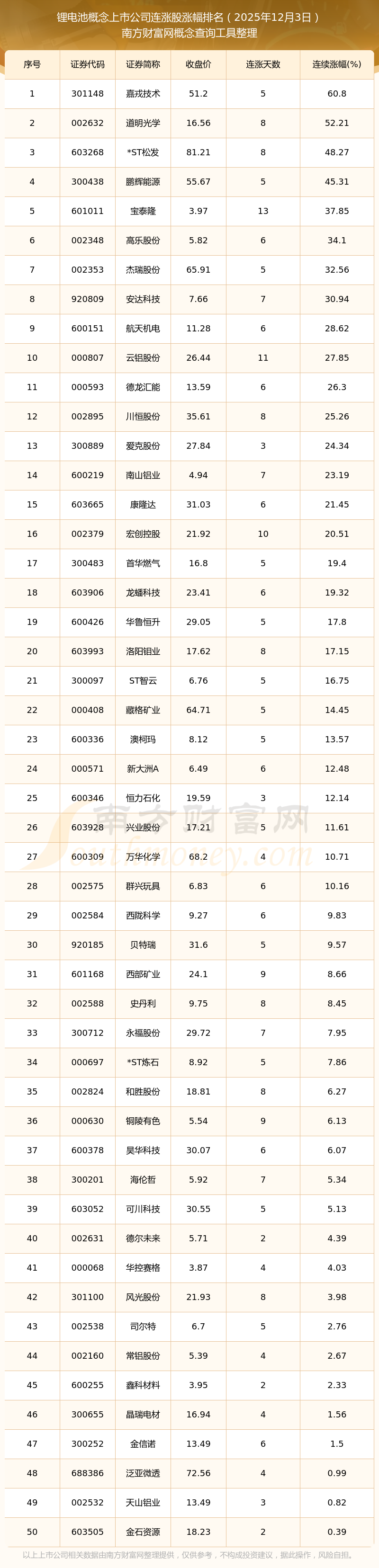 2025年12月3日锂电池概念上市公司连涨股票涨幅排名