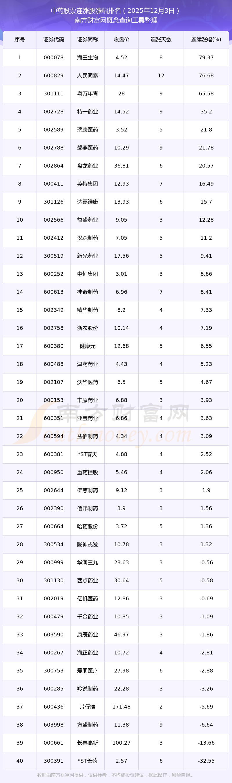 根据南方财富网概念查询工具数据统计,截止2025年12月3日收盘,中药股票共有40只个股实现连涨。其中连续涨幅较大的个股有海王生物、人民同泰、粤万年青等,连续涨幅分别为79.37%、76.68%、65.58%。