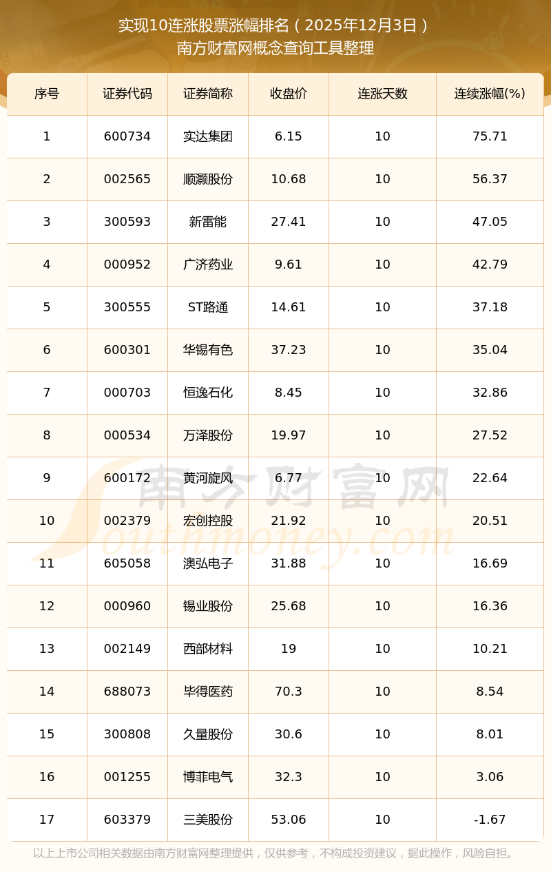 根据南方财富网概念查询工具数据统计,截止2025年12月3日收盘,共有17只个股实现10天连涨。其中连续涨幅较大的个股有实达集团、顺灏股份、新雷能等,连续涨幅分别为75.71%、56.37%、47.05%。
