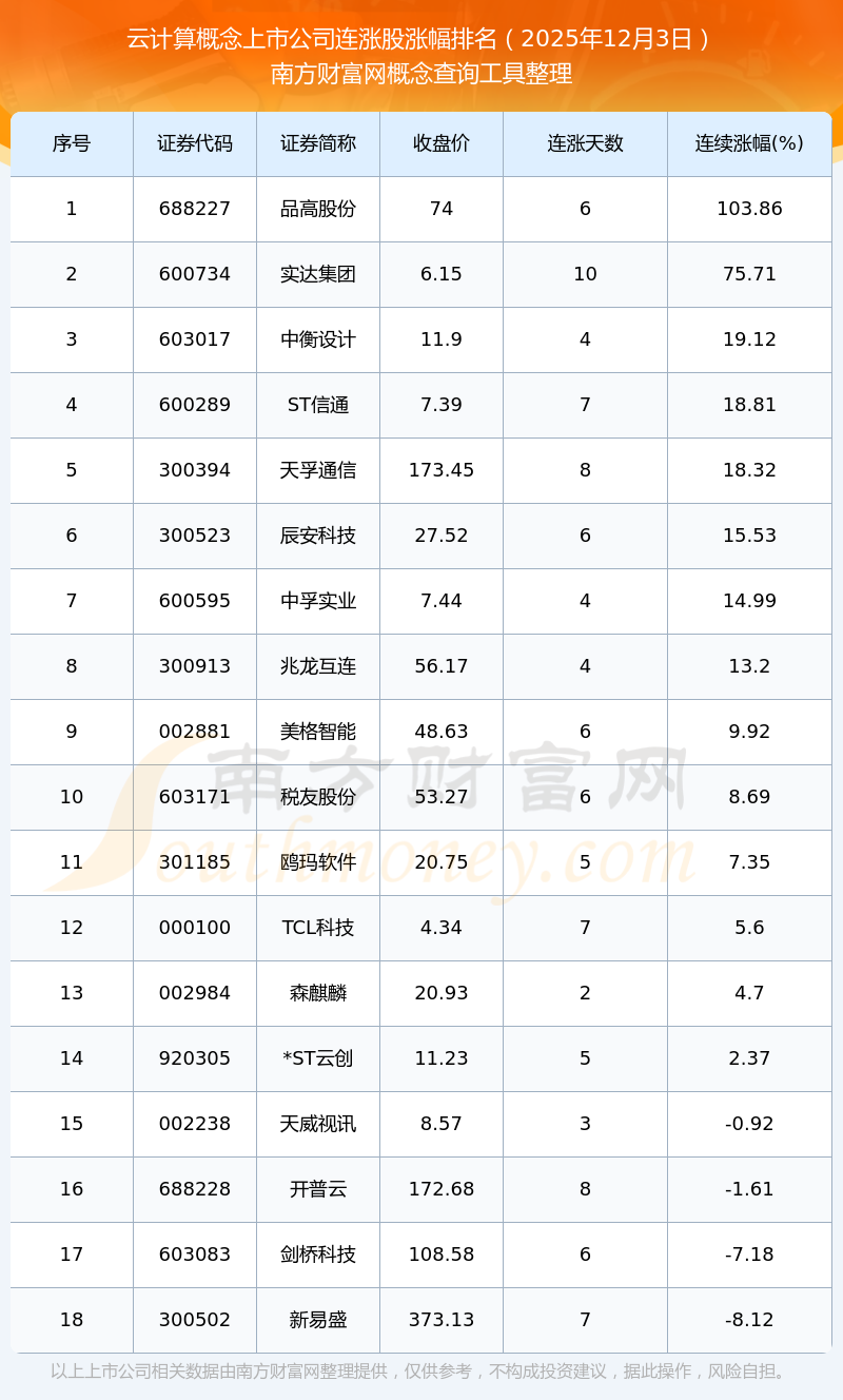 根据南方财富网概念查询工具数据统计,截止2025年12月3日收盘,云计算概念上市公司共有18只个股实现连涨。其中连续涨幅较大的个股有品高股份、实达集团、中衡设计等,连续涨幅分别为103.86%、75.71%、19.12%。