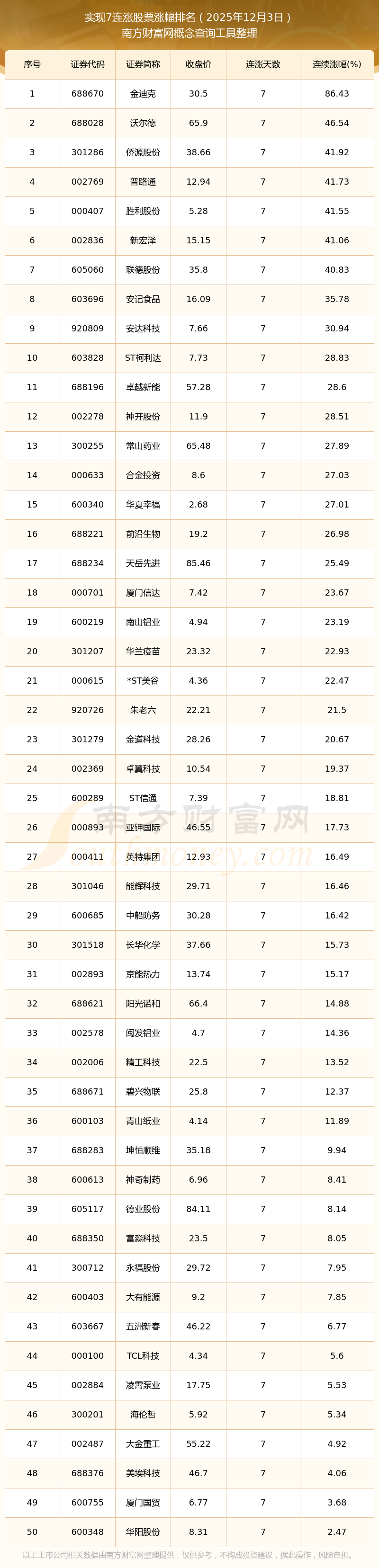 根据南方财富网概念查询工具数据统计,截止2025年12月3日收盘,共有59只个股实现7天连涨。其中连续涨幅较大的个股有金迪克、沃尔德、侨源股份等,连续涨幅分别为86.43%、46.54%、41.92%。