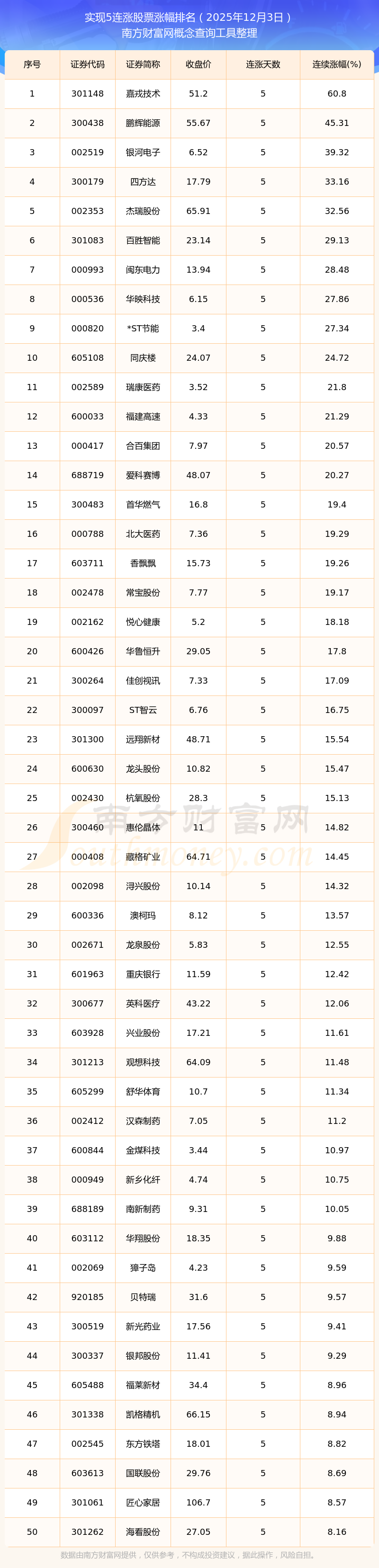 根据南方财富网概念查询工具数据统计,截止2025年12月3日收盘,共有99只个股实现5天连涨。其中连续涨幅较大的个股有嘉戎技术、鹏辉能源、银河电子等,连续涨幅分别为60.80%、45.31%、39.32%。