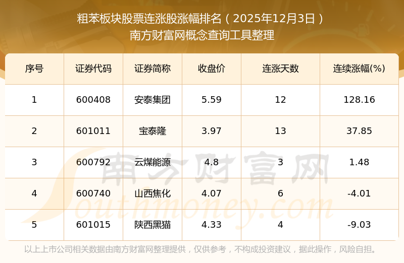 2025年12月3日粗苯板块股票连涨股涨幅排名