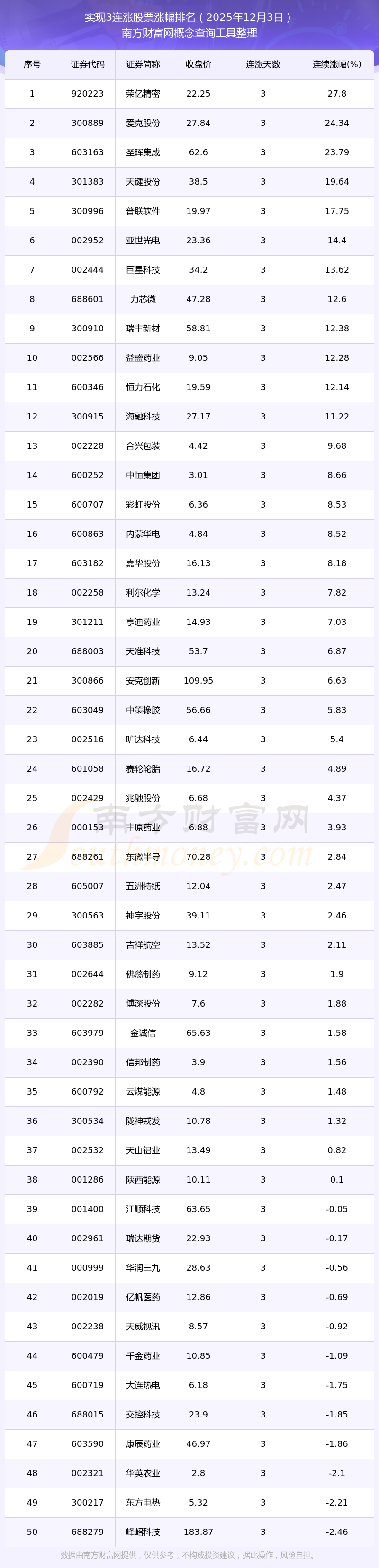 2025年12月3日实现3连涨股票涨幅排名