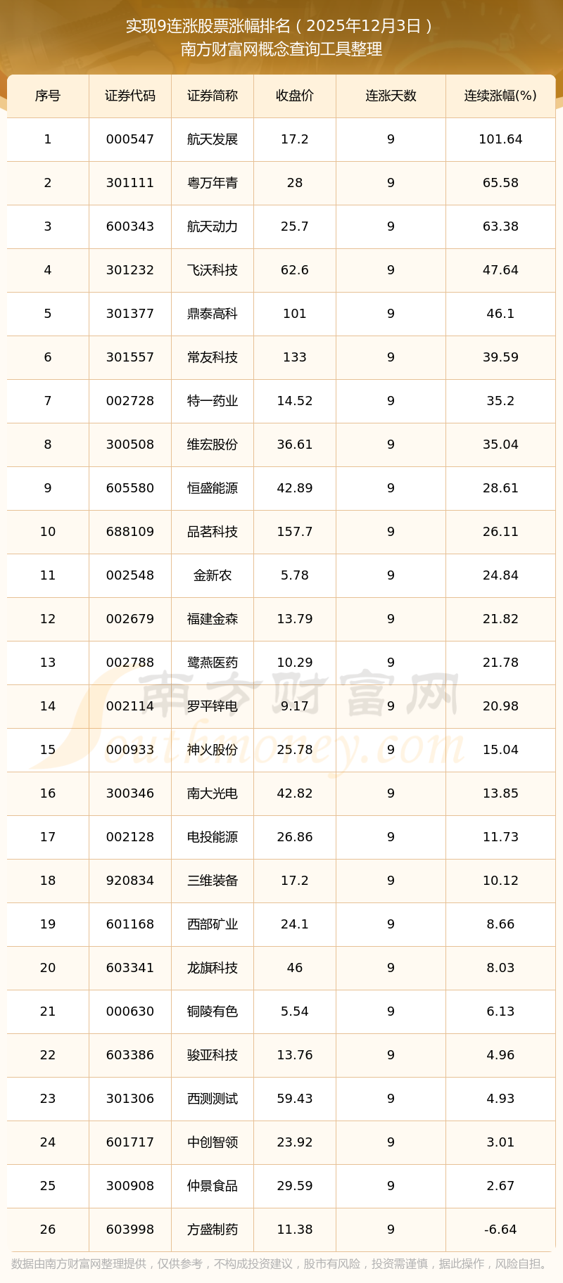 根据南方财富网概念查询工具数据统计,截止2025年12月3日收盘,共有26只个股实现9天连涨。其中连续涨幅较大的个股有航天发展、粤万年青、航天动力等,连续涨幅分别为101.64%、65.58%、63.38%。 2025年12月3日实现9连涨股票涨幅排名 数据由南方财富网提供,仅