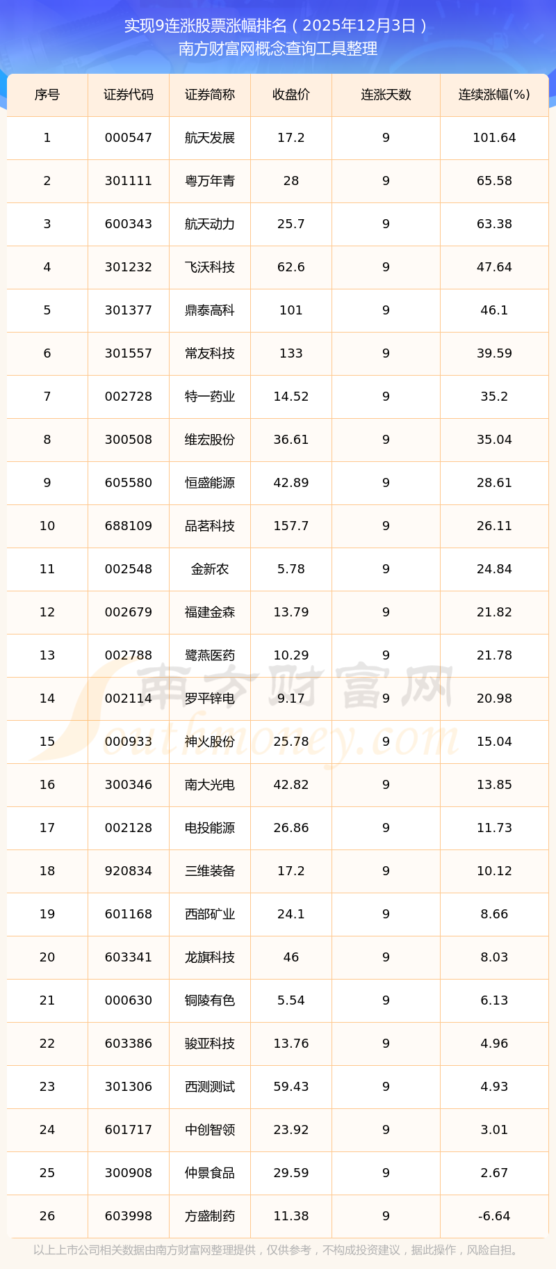 根据南方财富网概念查询工具数据统计,截止2025年12月3日收盘,共有26只个股实现9天连涨。其中连续涨幅较大的个股有航天发展、粤万年青、航天动力等,连续涨幅分别为101.64%、65.58%、63.38%。
