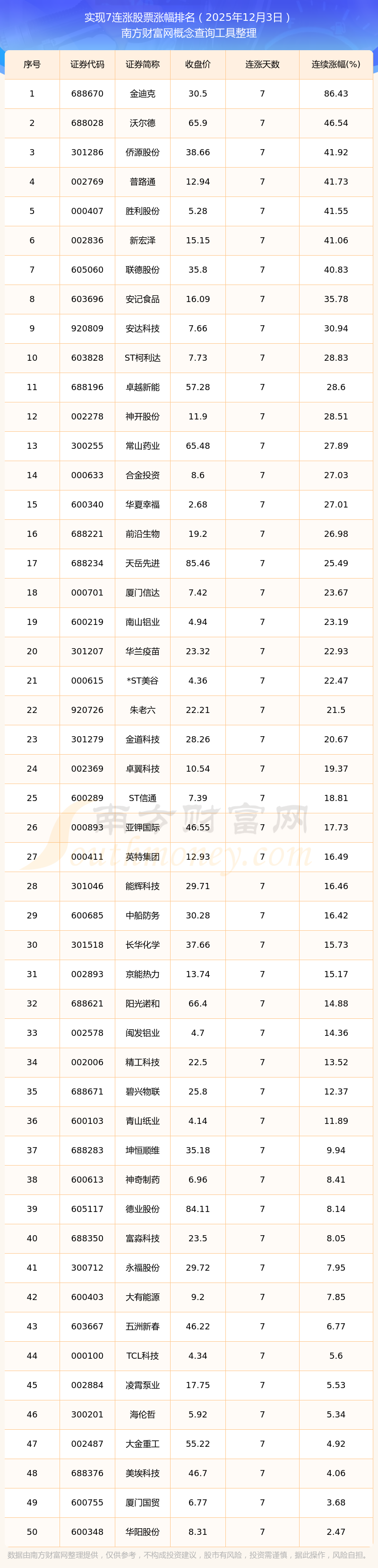 2025年12月3日实现7连涨股票涨幅排名