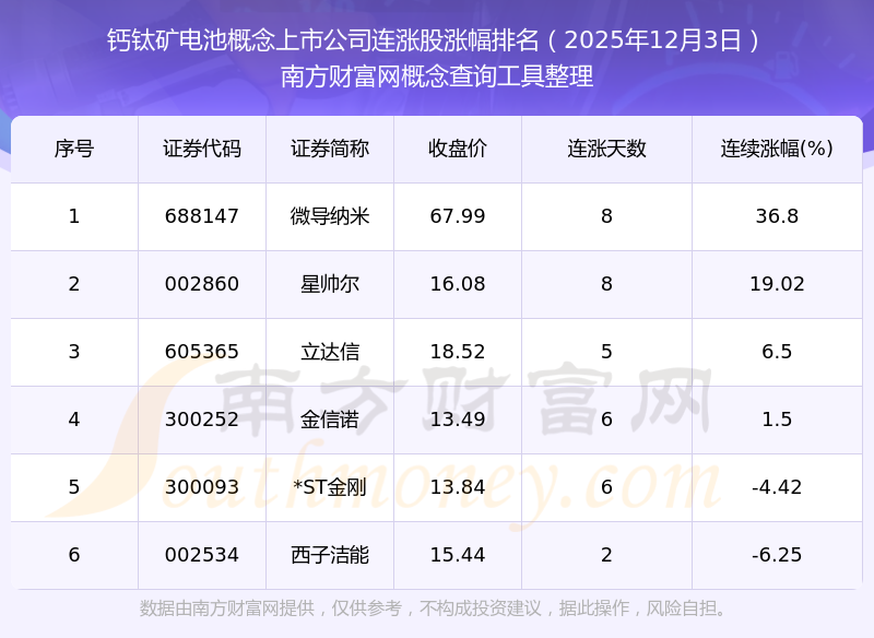 根据南方财富网概念查询工具数据统计,截止2025年12月3日收盘,钙钛矿电池概念上市公司共有6只个股实现连涨。其中连续涨幅较大的个股有微导纳米、星帅尔、立达信等,连续涨幅分别为36.80%、19.02%、6.50%。