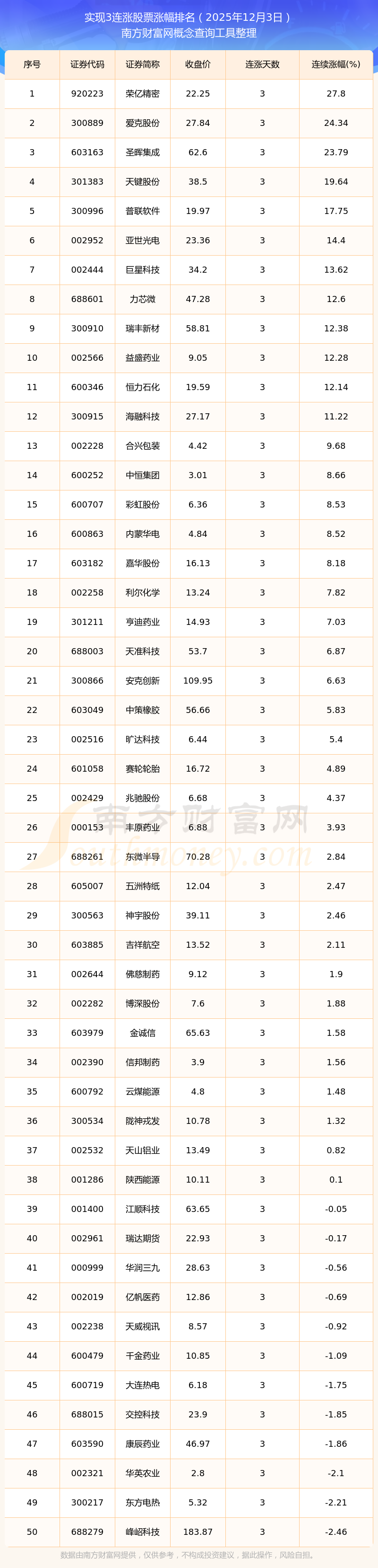 根据南方财富网概念查询工具数据统计,截止2025年12月3日收盘,共有69只个股实现3天连涨。其中连续涨幅较大的个股有荣亿精密、爱克股份、圣晖集成等,连续涨幅分别为27.80%、24.34%、23.79%。
