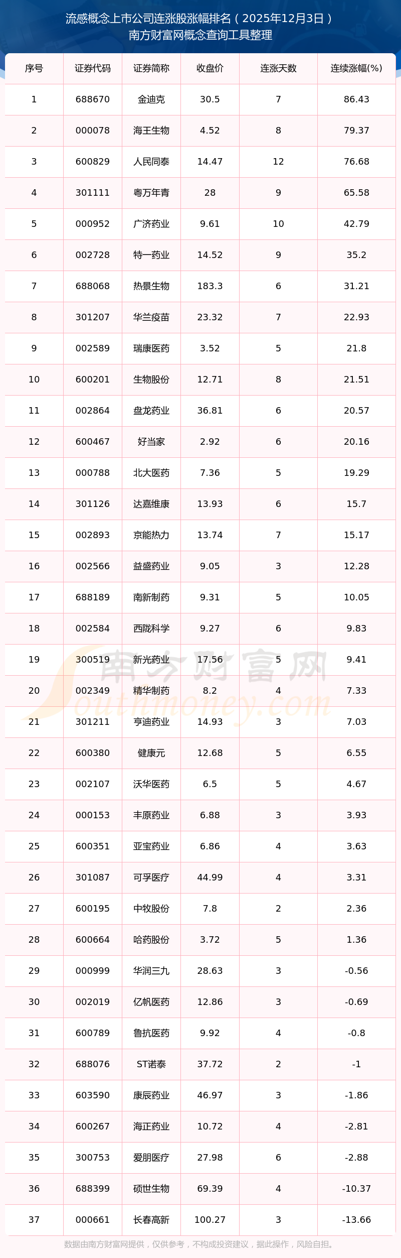 2025年12月3日流感概念上市公司连涨股涨幅排名