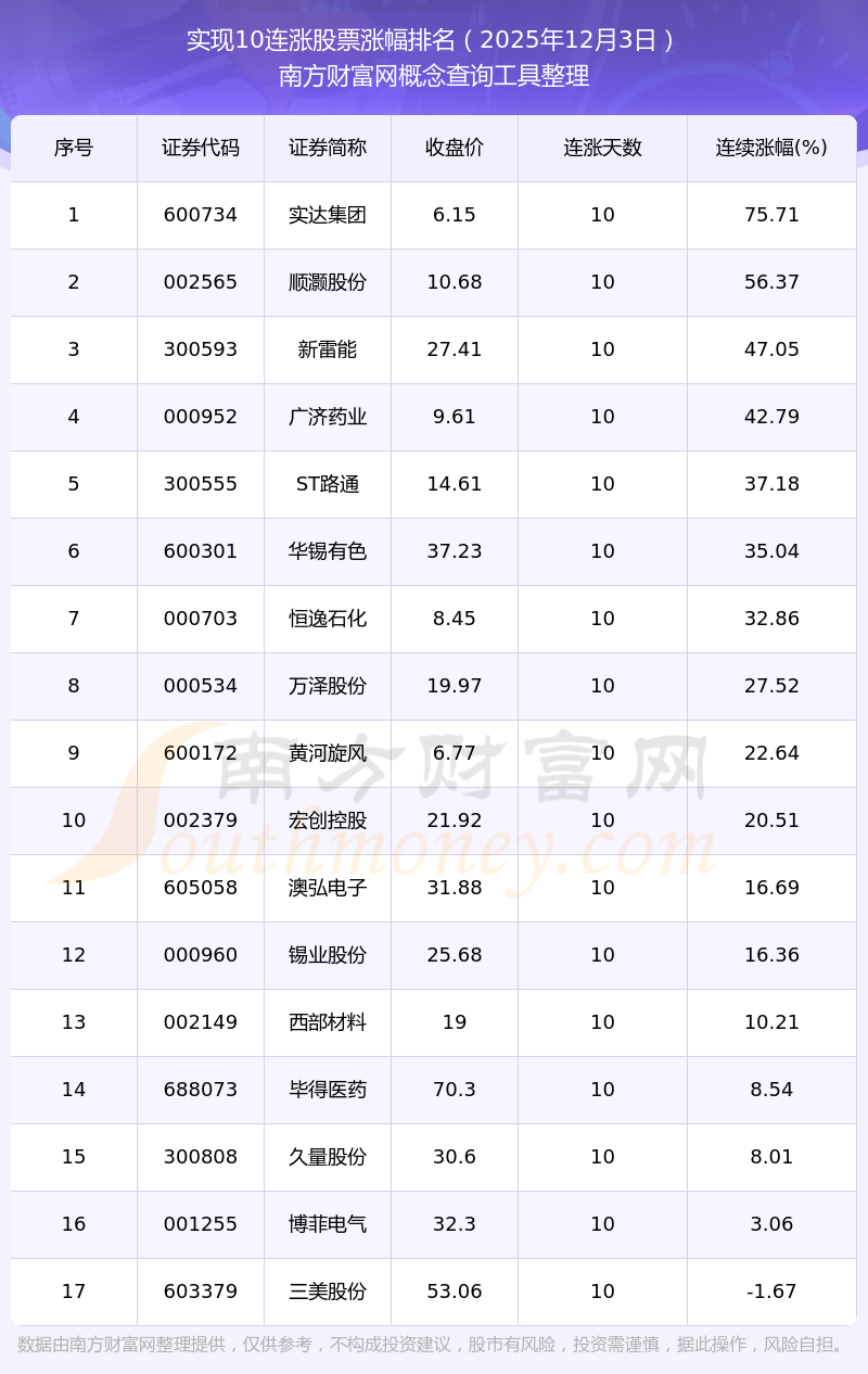 根据南方财富网概念查询工具数据统计,截止2025年12月3日收盘,共有17只个股实现10天连涨。其中连续涨幅较大的个股有实达集团、顺灏股份、新雷能等,连续涨幅分别为75.71%、56.37%、47.05%。