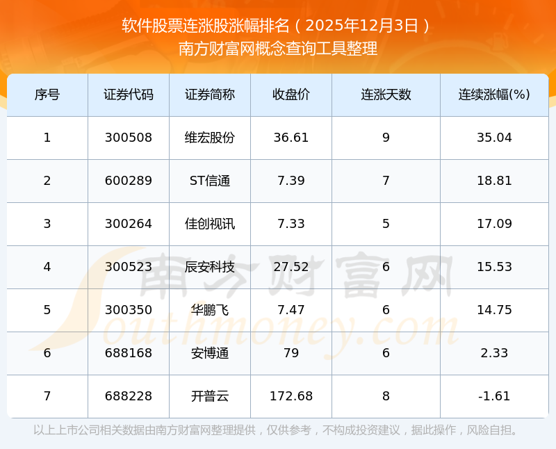 根据南方财富网概念查询工具数据统计,截止2025年12月3日收盘,软件股票共有7只个股实现连涨。其中连续涨幅较大的个股有维宏股份、ST信通、佳创视讯等,连续涨幅分别为35.04%、18.81%、17.09%。