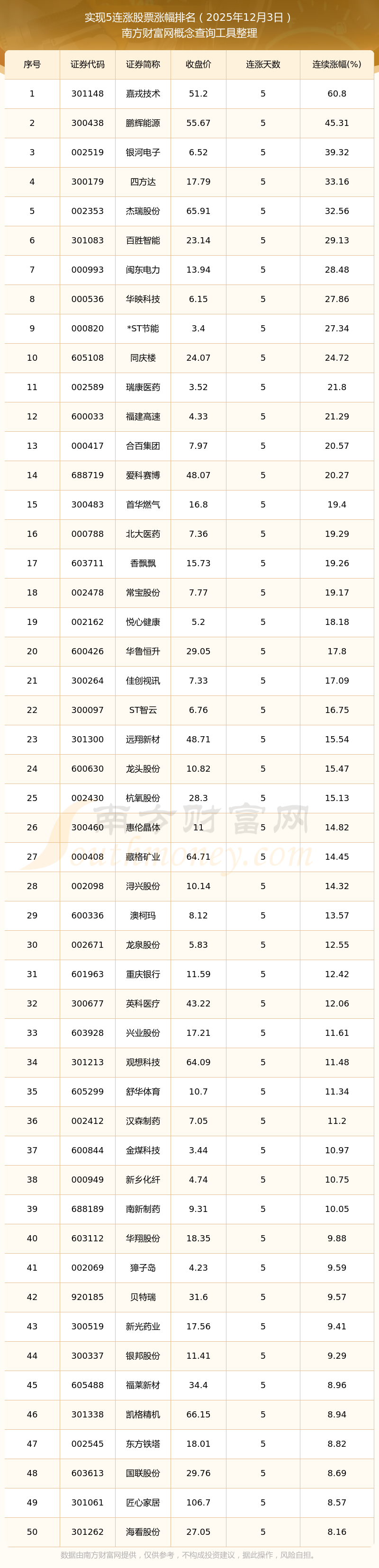 根据南方财富网概念查询工具数据统计,截止2025年12月3日收盘,共有99只个股实现5天连涨。其中连续涨幅较大的个股有嘉戎技术、鹏辉能源、银河电子等,连续涨幅分别为60.80%、45.31%、39.32%。