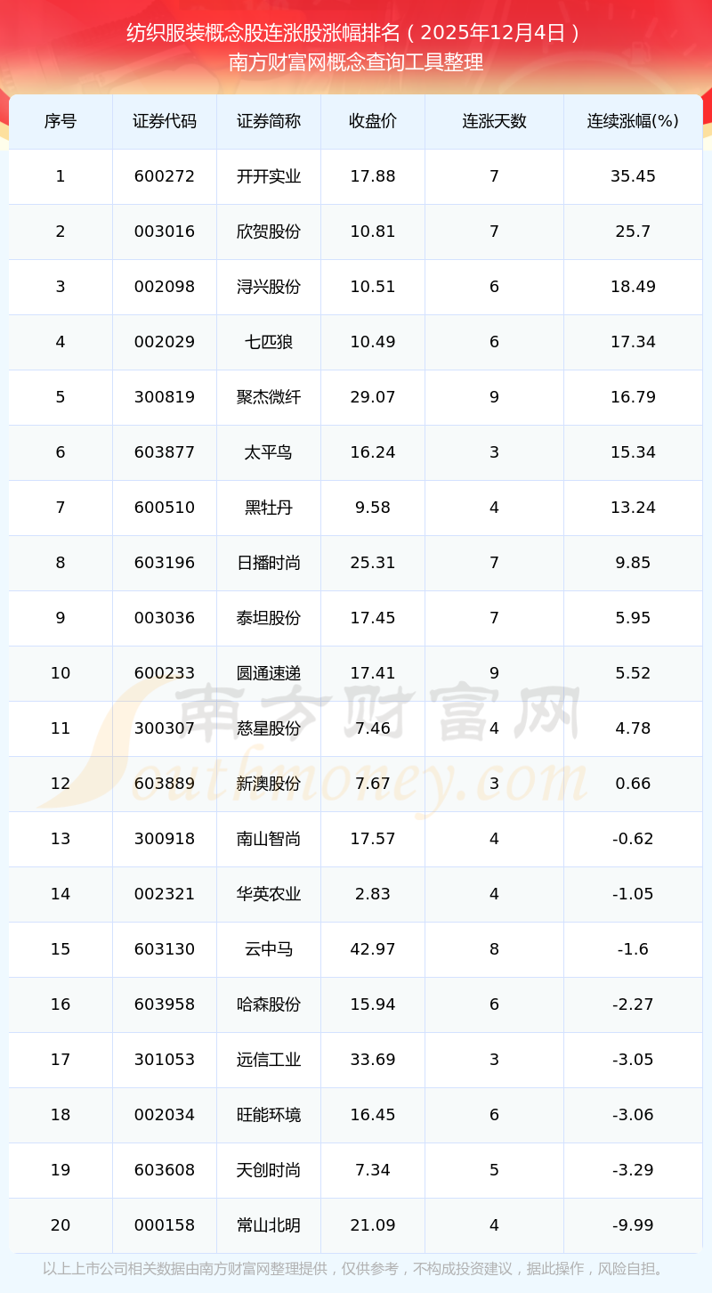 2025年12月4日纺织服装概念股连涨股涨幅排名